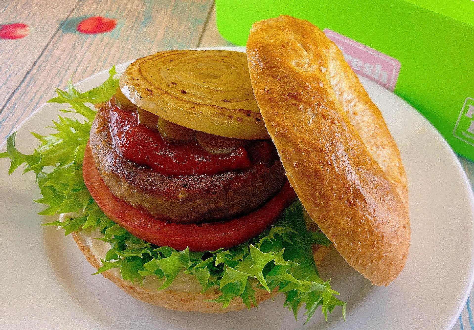 ヴィーガンバーガーベーグル(ヴィーガン) (牛粗びきパティを再現したプラントベースパティを使用しております。)