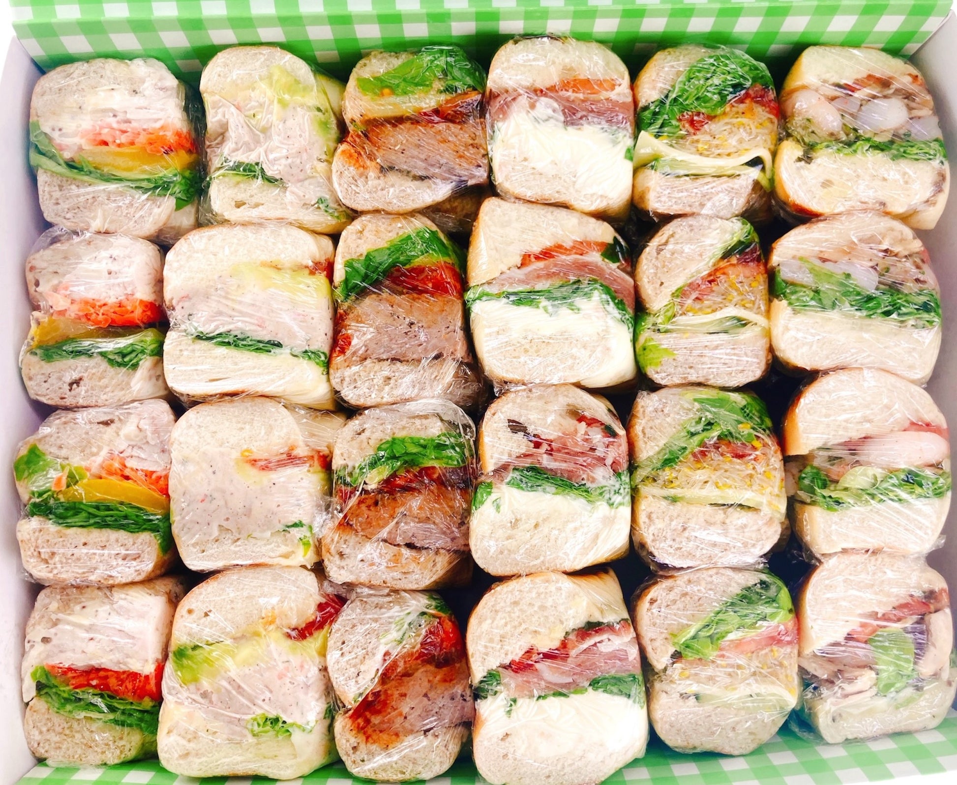 (1箱4~6人前 24個入) プロシュート&クリームチーズ、ツナ&アボカド、シュリンプ&マッシュルームソース、バーガーベーグル、コールドチキン&キャロットラペ、ベジタブル※全てラップで個包装しております。